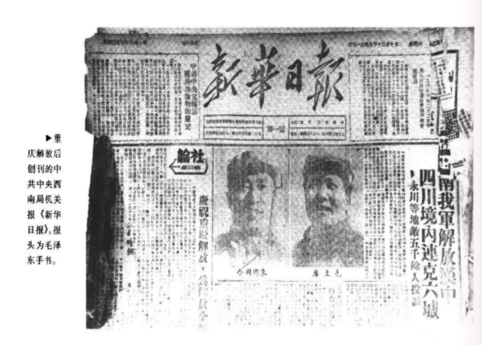 重庆解放后创刊的中共中央西南局机关报《新华日报》,报头为毛泽东手书