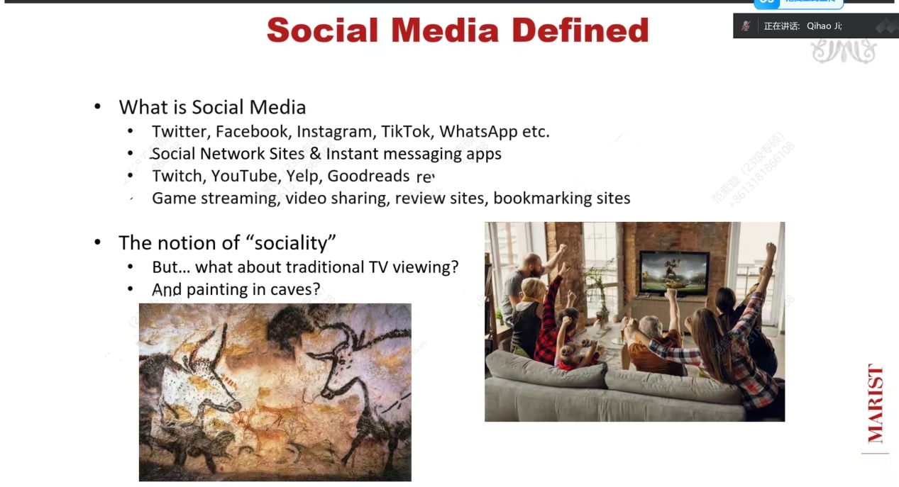 纪玘昊教授以专业的方式阐释了对“社交媒体”的定义,与社会性概念下的“社交媒体”定义进行差异比较,并举例探讨其内涵。通过展示社交媒体平台的演变过程,纪玘昊教授介绍了欧美语境下社交媒体平台与社会问题互动的三个维度。他结合具体实验与案例,探讨了社交媒体作为大平台及满足用户需求的工具的几类关键问题,并指出社交媒体既不是消极的,也不是积极的,呼吁对社交媒体在社会中的作用进行更新颖、更细致的讨论。