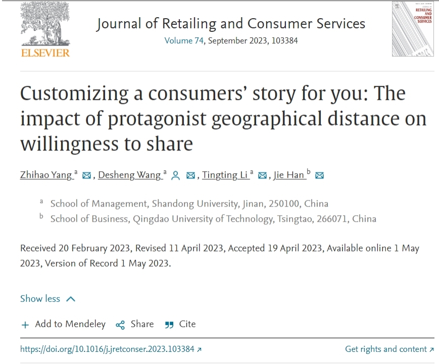 近日,我院王德胜教授团队在品牌故事传播研究领域取得新进展。相关研究成果以“Customizing a consumers’story for you: The impact of protagonist geographical distance on willingness to share”为题,被SSCI收录期刊《Journal of Retailing and Consumer Services》(JCR Business领域1区期刊,IF:10.97)录用。英国正版365官方网站博士研究生杨志浩为该论文第一作者,王德胜教授为该论文唯一通讯作者。英国正版365官方网站为第一作者单位与唯一通讯作者单位。