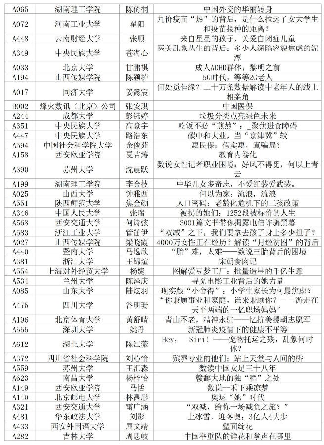 本次大赛由中央民族大学新闻与传播学院、西安交通大学新闻与新媒体学院共同举办,共吸引来自清华大学、北京大学、上海交通大学、复旦大学、南京大学等上百所高校和数十家传媒单位的超过900支队伍,4500余人报名,最终有效作品数量为861,作品质量再创新高。经过初评、复评与网络投票,来自59所高校和媒体机构的100支队伍入围决赛,角逐等级奖,决赛评出10名一等奖、20名二等奖、30名三等奖和40名优秀奖。
