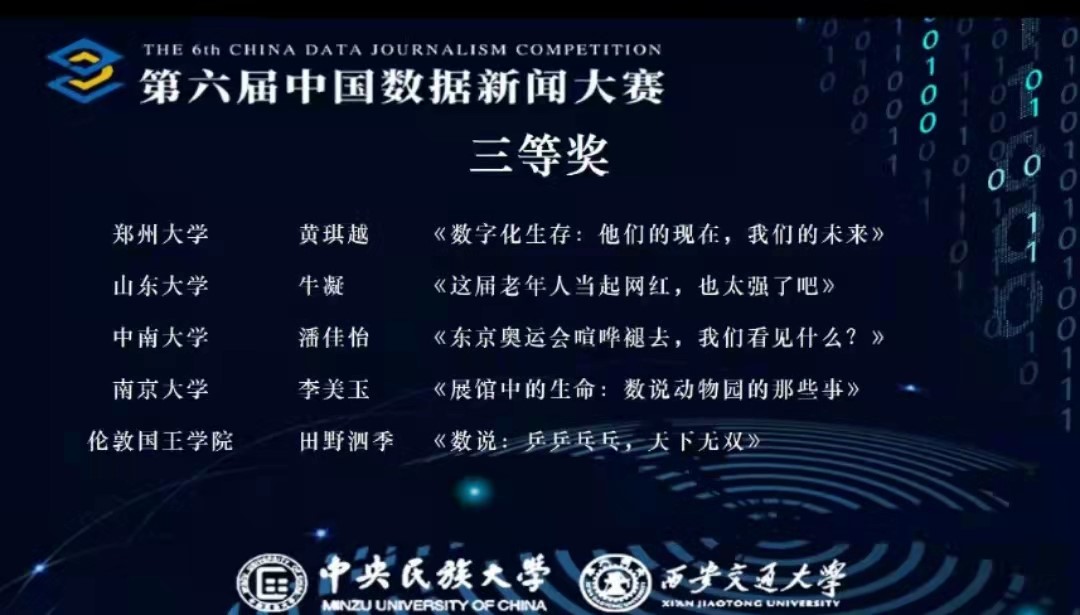 11月6日第六届中国数据新闻大赛决赛落下帷幕,我院2018级本科生牛凝、杨婷丹、汪龙佳团队参赛作品《这届老年人当起网红,也太强了吧!》获得三等奖、研究生陆炫羽团队作品《现实版“小舍得”:小学生家长为何最焦虑?》获得优秀奖、新媒体系教师侯滢和实验室助教郭嘉良分别获得优秀指导教师奖