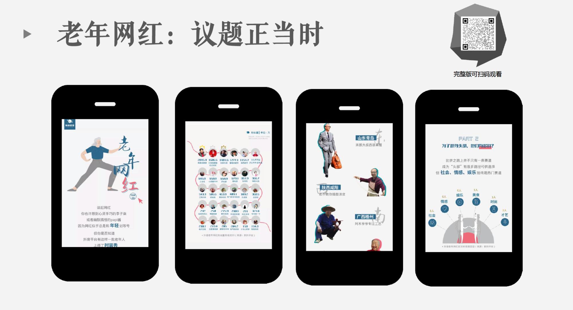 据悉,我院三等奖获奖作品《这届老年人当起网红,也太强了吧!》是基于新媒体系侯滢老师主讲的《数据新闻及可视化》课程作业优化而成。团队成员在课堂选题时关注到2021年CNNIC发布的最新互联网发展报告,数据显示我国60岁及以上网民占比11.2%,其中不乏老年人新媒体使用熟练的网红。由此,团队以老年网红为切入点,探究老年网红的创作质量、经济效益和社会影响,呈现“积极老龄化群体”的社会实况,使得更多人看到老年群体在网红行业的成就,为积极触网的“新潮”老年人正名,为代际交流、理解、包容做出贡献。其次在图文设计方面,结合精准可溯源的数据与符合视觉偏好的图像,使读者轻松理解新闻中的复杂数据,快速获取核心信息。作品运用极具创意的设计图形、插画,融合了交互的元素,力求达到和谐、简洁、易读的可视化效果。
