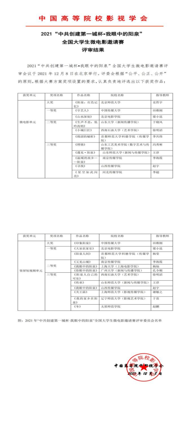12月12日,2021中国高等院校影视学会全国大学生微电影邀请赛颁奖典礼在山西阳泉落下帷幕。本年度主题为“中共创建第一城杯•我眼中的阳泉”。我院参赛作品《生声不息:低吟高唱》荣获微电影单元二等奖,《阳泉:动静之间》荣获短视频单元优秀奖,我院副教授、英国正版365官方网站影视文化艺术传播研究中心执行主任于晓风荣获“优秀指导教师奖”。
