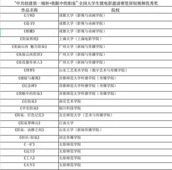 本届大赛评委会由中国高等院校影视学会副会长、国家广播电视总局媒体融合发展司原司长杨杰,中国高等院校影视学会原副会长、微电影专业委员会主任委员姚国强,中国传媒大学教授、首都师范大学科德学院传媒学院院长云贵彬,第五代著名导演、中国传媒大学教授梁明,中国高等院校影视学会副会长兼秘书长、中国传媒大学科研处副处长张国涛,中国高等院校影视学会副秘书长、北京师范大学艺术与传媒学院副院长杨乘虎,中国高等院校影视学会副秘书长、北京电影学院视听传媒学院院长程樯,以及中国高等院校影视学会微电影专业委员会秘书长、首都师范大学科德学院传媒学院副院长王锟8位专家组成;主任由中国高等院校影视学会原会长、北京电影学院党委副书记、副校长胡智锋和中国高等院校影视学会会长、中国艺术研究院影视所研究员丁亚平出任。来自北京师范大学、南京大学、中国传媒大学、北京电影学院、上海大学、广州大学、山东师范大学、西南石油大学、南京艺术学院、首都师范大学、上海师范大学等全国各大高校的22支代表队、百余名参赛师生、共计57部作品(其中微电影24部,短视频33部)以为期四天的限时创作形式讲述眼中的阳泉。
