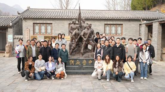 学院一行首先前往青州九龙峪片区,参观红色鲁中纪念馆和临朐战役纪念谷(陈毅纪念馆),通过馆藏文献、历史图像与复原场景系统回顾鲁中革命根据地的创建历程,深刻认识其在抗战和解放战争时期的重要战略位置。纪念馆以“鲁中战略区创建、政权建设、支前保障、主要战役、革命群像”等板块,全面呈现了鲁中军民在极端艰苦条件下浴血奋战、守土图存的壮阔历史。在临朐战役相关展陈前,大家进一步学习陈毅等老一辈革命家在鲁中指挥战役的历史背景和决定性意义,切实体会到革命成果的弥足珍贵。展厅内陈列的战役沙盘、生动复原的指挥情景以及珍贵的作战电报手稿,让师生仿佛置身当年的战场氛围;一幅幅烈士遗像和支前故事,更让大家深切感受到革命胜利背后蕴含的牺牲与奉献。