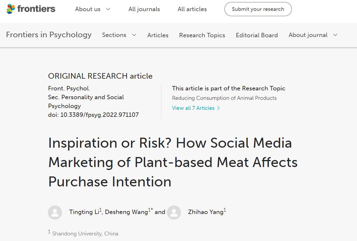 近日,公司王德胜教授作为通讯作者在SSCI收录期刊《Frontiers in Psychology》(JCR 1区期刊,2022年10月)发表论文《Inspiration or risk? How social media marketing of plant-based meat affects young people’s purchase intention》,英国正版365官方网站为唯一通讯作者单位。《Frontiers in Psychology》是综合性的心理学领域专业学术期刊,创立于2010年,已被国际社会科学引文索引(Social Science Citation Index,SSCI)数据库正式收录,2022年影响因子(impact factor,IF)为2.99,论文总引用率排名第一,涵盖了几乎所有心理学领域的研究主题。
