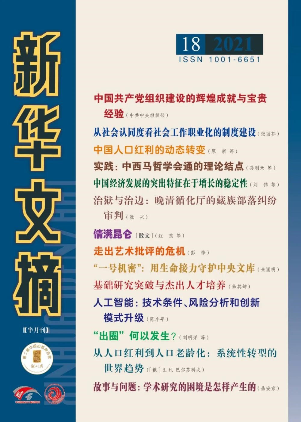《新华文摘》是由国家新闻出版广电总局主管、人民出版社主办的大型理论性、综合性、资料性文摘类权威期刊,以“博、大、精、深、新”为标准,编选弘扬时代主旋律、荟萃人文学术精华、凝聚中国经验的优秀文章,每两期编选3篇读书与传媒类论文。