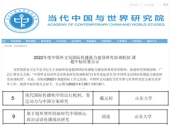 近日,中国外文局公布了“中国外文局国际传播能力建设研究协调机制课题”立项名单,公司两项课题获得招标立项,分别是戴元初教授获得的重点课题“现代国际传播秩序的运行机制、变迁动力与中国方案研究”和邱凌教授获得的一般课题“基于境外智库的新时代中国核心政治话语传播现状研究”;此次课题招标是中国外文局在国内外进行的公开招标,在激烈的竞争中公司获得两项课题立项的殊荣。